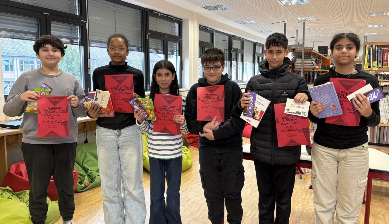 Lena Sakupwanya (6f) und Berat Degirmen (6b) setzten sich dabei die ,,Lesekrone” auf und lasen am besten. Lena hatte sich für das Buch ,,Gangsta Oma” von David Williams entschieden, während Berats Wahl auf ,,Scary Harry, Totgesagte leben länger” von Sonja Kaiblinger fiel. Knapp hinter dem ersten Platz landeten Joyce Gourgui und Mirac Erdal (beide 6c) auf Rang zwei. Joyce las aus Isabel Abedis ,,Lola in geheimer Mission” vor und Mirac aus Erich Kästners Klassiker ,,Emil und die Detektive”. Das Podium der besten Leserinnen und Leser komplettierten Farida Mekkour (6e) sowie Ferhat Dincer (6a). Sie hatten sich für ,,Die drei Fragezeichen” von André Marx bzw. ,,Greg’s Tagebuch – kein Plan von nix ” von Jeff Kinney entschieden. ESG-Lehrerin Isabell Katz saß in der Jury und überreichte Büchergutscheine und Süßigkeiten als Preise, die der Förderverein gestiftet hatte. Herzlichen Glückwunsch an die erfolgreichen Vorleserinnen und Vorleser! HI