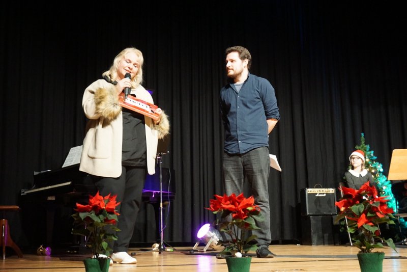 Der zweite Teil des Abends begann mit einer Ehrung. Seit einiger Zeit vergibt der Förderverein einen Förderpreis, um besonderen Einsatz zu würdigen. Am Konzertabend sprach Vorsitzende Sabine Wanka-Keskiner gar von „herausragendem Engagement“. Ihre Worte galten ESG-Lehrer Sven Schog, der die Schulhofumgestaltung entschieden vorangetrieben und einen großen Beitrag dazu geleistet hatte, dass mittlerweile ein Sitzkreis aus Steinen den großen Schulhof ziert. Sven Schog erhielt daher den mit 500 Euro dotierten Förderpeis. Das Geld wird er in die Ausstattung der Sporthalle investieren. Danach erklangen wieder musikalische Töne. Die Orchesterkinder ließen den vor einigen Jahren komponierten ESG-Song wiederaufleben. Die „Schulhymne“ mischte sich unter die weihnachtlichen Stücke. Patriotisch ging es beim Auftritt der Klasse 6d zu: Sie sang neben „Snowman“ ein Kölsches Weihnachtslied. Liliana Morlang (Q2) sorgte im Anschluss für eine weitere Solodarbietung: Am Klavier spielte sie „Drei Nüsse für Aschenbrödel“. Zusammen mit Eveline Neubert moderierte sie übrigens auch das Konzert. Alle Musikerinnen und Musiker setzten gemeinsam einen Schlussakkord. Sie gaben mit Zipfelmützen auf den Köpfen „Feliz Navidad“ als Höhepunkt des Abends zum Besten.