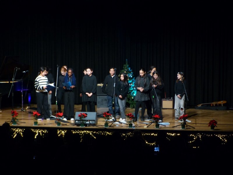 Den Anfang machten unterdessen einige Musiklehrerinnen und -lehrer. Sie eröffneten das Konzert und spielten das beliebte „Winter Wonterland“. Es folgten die Klassen 5b und 5f mit dem Stück „Underneath the Tree“. Danach stand der erste Solistinnen-Auftritt an. Sofia und Ayse (beide 6f) beeindruckten das Publikum mit „Hit the road Jack“. Im Anschluss füllte sich die Bühne wieder. Das Bläser- und Gitarrenensemble sorgte u.a. durch „Stille Nacht“ für Besinnlichkeit. Den Schlusspunkt des ersten Teils setzte die Klasse 5e, die u.a. „Schneeflöckchen“ sang.