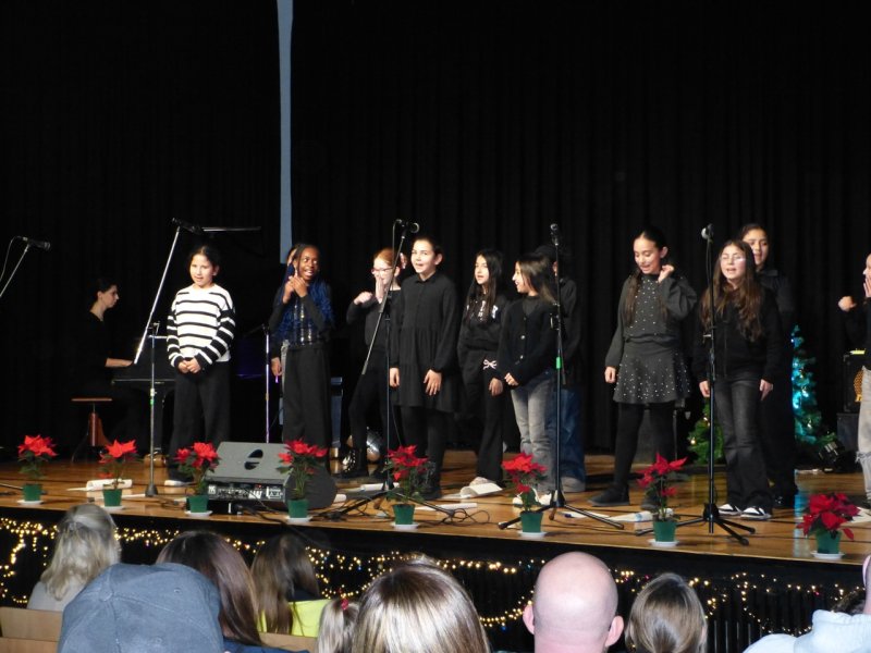 Den Anfang machten unterdessen einige Musiklehrerinnen und -lehrer. Sie eröffneten das Konzert und spielten das beliebte „Winter Wonterland“. Es folgten die Klassen 5b und 5f mit dem Stück „Underneath the Tree“. Danach stand der erste Solistinnen-Auftritt an. Sofia und Ayse (beide 6f) beeindruckten das Publikum mit „Hit the road Jack“. Im Anschluss füllte sich die Bühne wieder. Das Bläser- und Gitarrenensemble sorgte u.a. durch „Stille Nacht“ für Besinnlichkeit. Den Schlusspunkt des ersten Teils setzte die Klasse 5e, die u.a. „Schneeflöckchen“ sang.