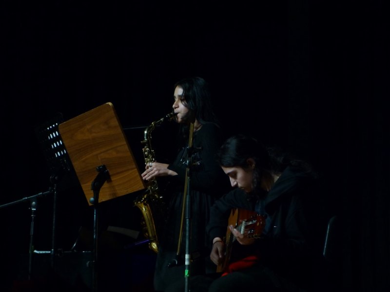 Den Anfang machten unterdessen einige Musiklehrerinnen und -lehrer. Sie eröffneten das Konzert und spielten das beliebte „Winter Wonterland“. Es folgten die Klassen 5b und 5f mit dem Stück „Underneath the Tree“. Danach stand der erste Solistinnen-Auftritt an. Sofia und Ayse (beide 6f) beeindruckten das Publikum mit „Hit the road Jack“. Im Anschluss füllte sich die Bühne wieder. Das Bläser- und Gitarrenensemble sorgte u.a. durch „Stille Nacht“ für Besinnlichkeit. Den Schlusspunkt des ersten Teils setzte die Klasse 5e, die u.a. „Schneeflöckchen“ sang.