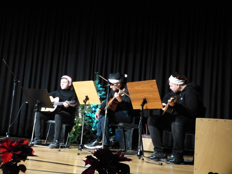 Den Anfang machten unterdessen einige Musiklehrerinnen und -lehrer. Sie eröffneten das Konzert und spielten das beliebte „Winter Wonterland“. Es folgten die Klassen 5b und 5f mit dem Stück „Underneath the Tree“. Danach stand der erste Solistinnen-Auftritt an. Sofia und Ayse (beide 6f) beeindruckten das Publikum mit „Hit the road Jack“. Im Anschluss füllte sich die Bühne wieder. Das Bläser- und Gitarrenensemble sorgte u.a. durch „Stille Nacht“ für Besinnlichkeit. Den Schlusspunkt des ersten Teils setzte die Klasse 5e, die u.a. „Schneeflöckchen“ sang.